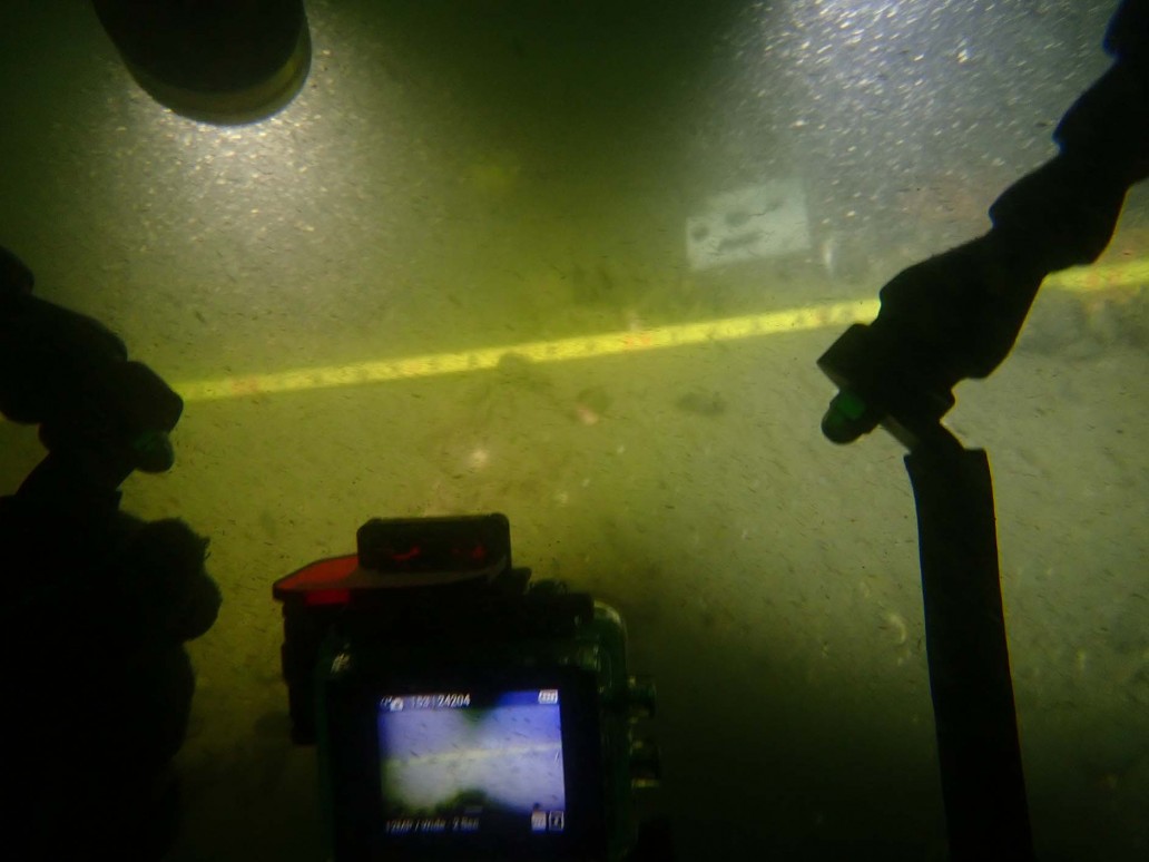→ metal signatures in a linear formation may be indicative of iron fasteners in timbers, cannon and kentledge (ballast) beneath the silt - photography for photogrammetry purposes (reconstructing the subject in 3D with specialised software)
